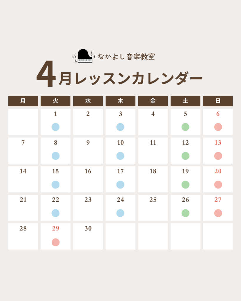 音楽教室では、いろんなレッスンがあり、営業日カレンダーをスマートに見せるデザインがあったら良さそうと思い、制作させていただきました!トップはシンプルに、ページをめくるとクラスの詳細が見えるようなテンプレートにしています。