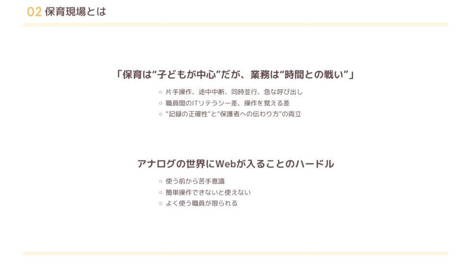 保育園運営会社でスーパーバイザーとしてお仕事をしていた経験から、保育現場にシステムが入ることのハードルや、実際導入するにあたって、企業と保育園では伝えた言葉の違いがあること等をお話ししました。