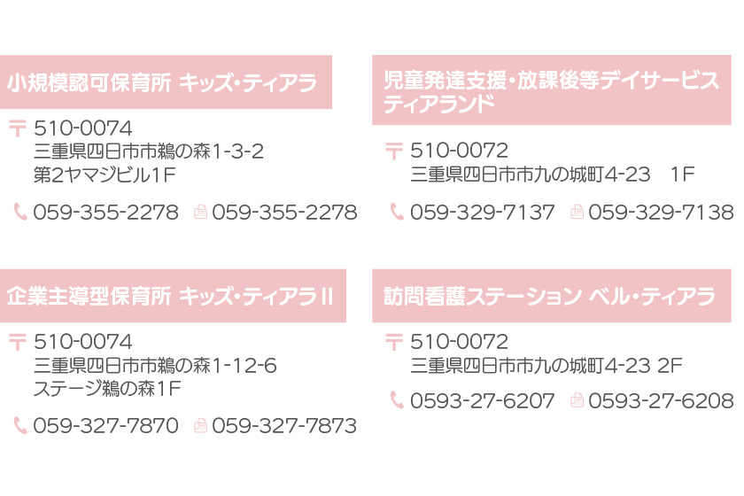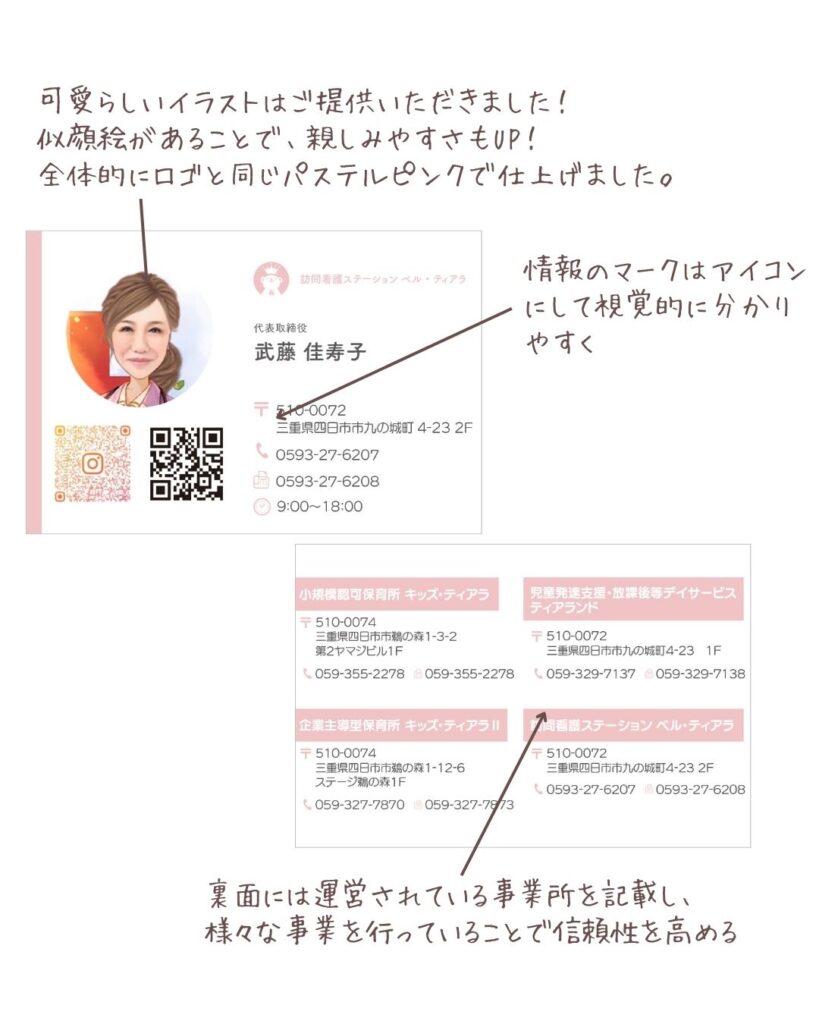 事業を開始されるとのことで、ロゴ、名刺、ホームページの開業3点セットにて、制作のご依頼をいただきました!他にもすでに事業所を展開されており、企業主導型保育園の運営も行っている福祉関係事業を行っている会社様です。ロゴのピンクに合わせてパステルピンクを使用し、似顔絵のイラストはご提供いただきました。