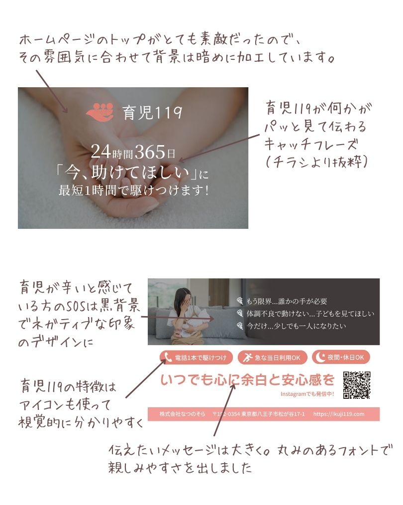 個人の名刺ではなく、育児119という活動があるということを知っていただくことを目的としているため育児119のキャッチフレーズと概要、QRはInstagramを載せました。