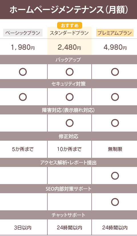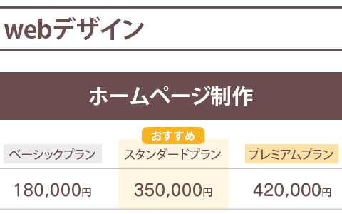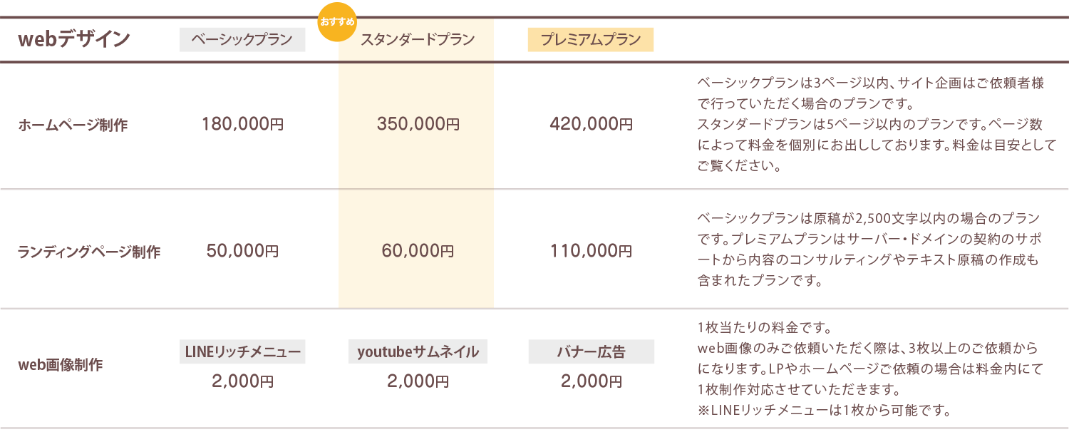 ●スタンダードプランはホームページや名刺、チラシ・ポスターの中から1つ、合わせてご依頼いただける場合のプランです。